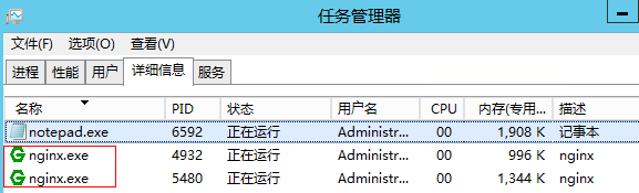 那么怎么知道自己的nginx是否啟動(dòng)成功:打開(kāi)你的管理器,如在進(jìn)程中看到兩個(gè)nginx說(shuō)明啟動(dòng)成功