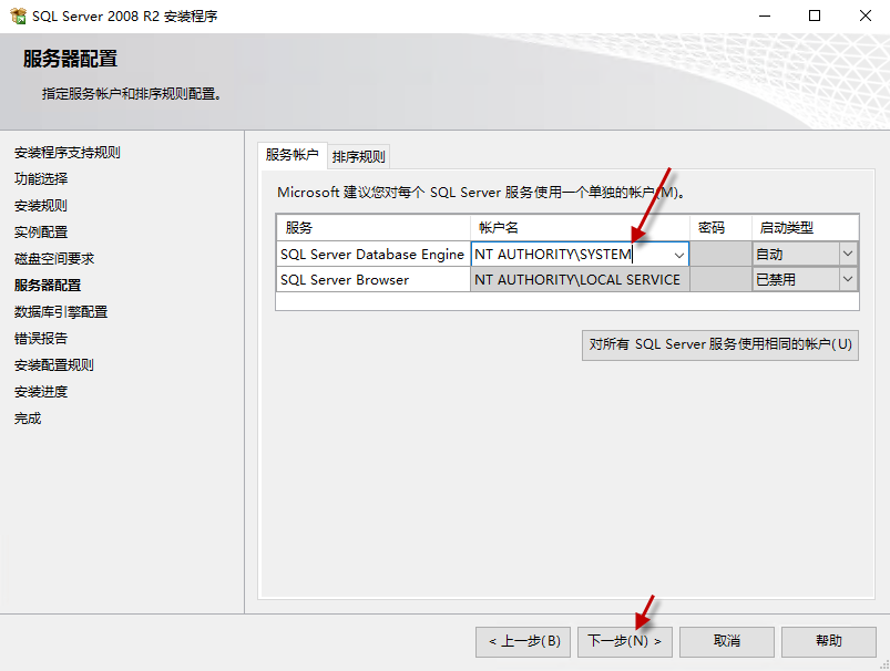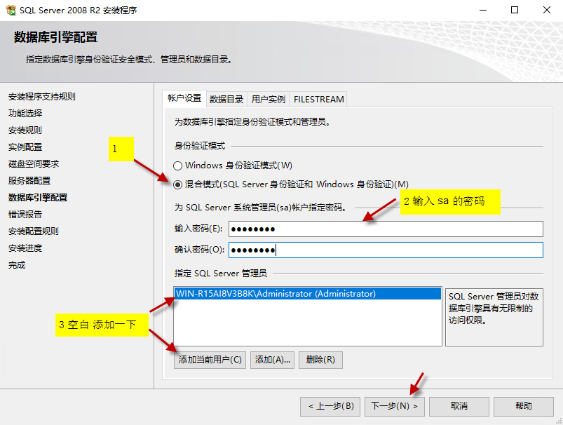 注意:身份認證模式必須選擇 混合模式; 為sa 的賬號輸入密碼,后面安裝的軟件的時候會用到